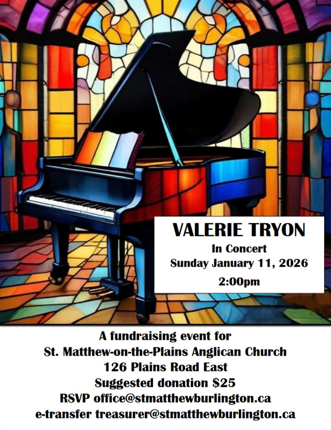 VALERIE TRYON IN CONCERT – Come and here the renowned pianist play at St. Matthew’s. This is a fundraising event for the church. Suggested donation: $25. Please contact the office to reserve your seat.