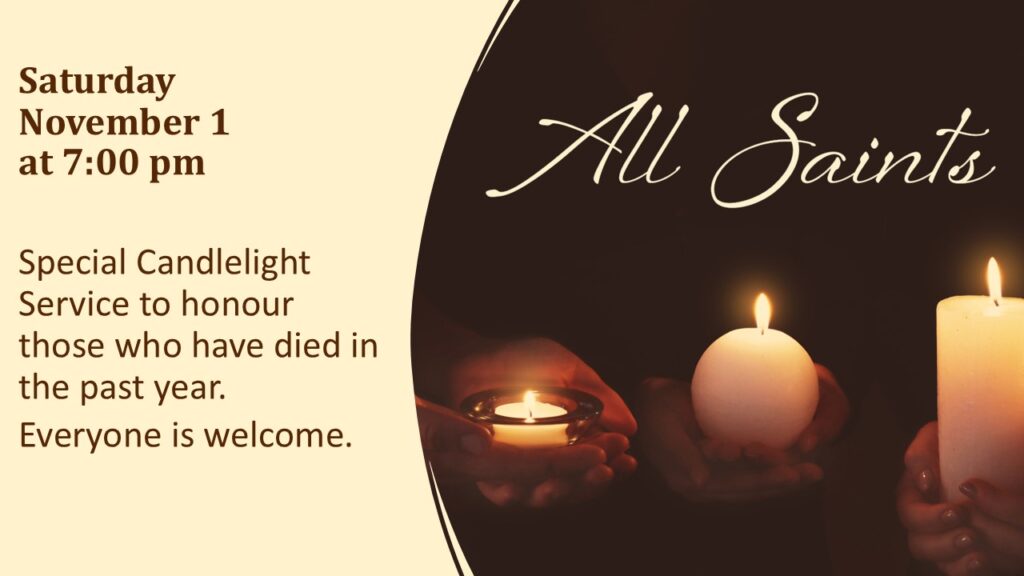 ALL SAINTS SERVICE – Special Candlelight service to honour and remember those who have died in our community in the past year. If you would like your loved one remembered, please contact the office via email by Tuesday, October 28. Everyone is welcome.