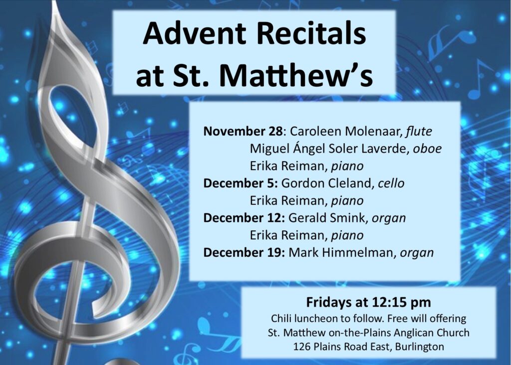 Advent Recitals – Fridays in Advent at 12:15 pm with a chili luncheon to follow. Please see the poster below for a list of musical guests.