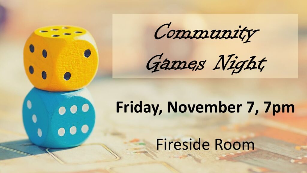 GAMES NIGHT – All are welcome to show up an play. Bring your own game or learn a new one. Bring a friend or make some friends! Offered one Friday per month.