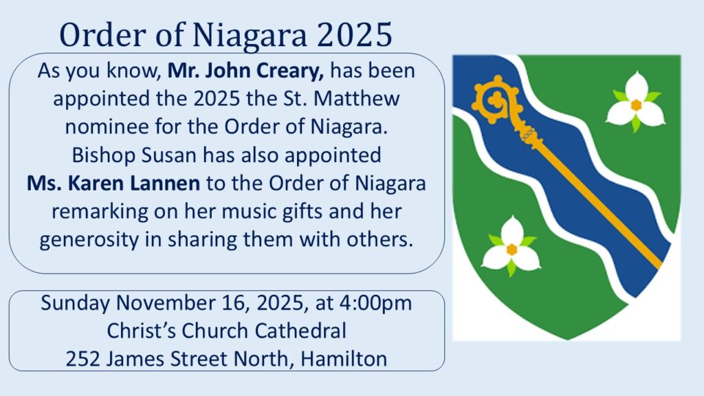 Order of Niagara – Bishop Susan has appointed Mr. John Creary and Karen Lannen to the Order of Niagara for 2025 for sharing their gifts with the community. We celebrate them on Sunday, November 16, 2025, at 4:00 pm at Christ’s Church Cathedral, 252 James Street North, Hamilton. Arrive early as parking is limited.