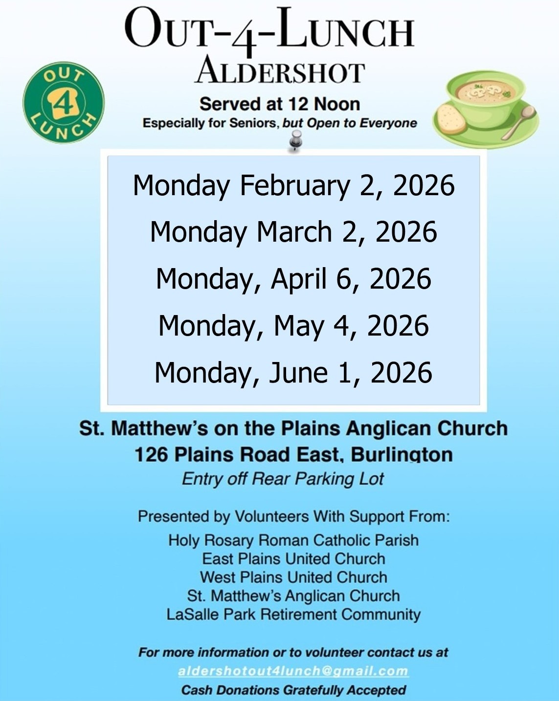 OUT-4-LUNCH – Community meal served once a month on a Monday at noon. Especially for seniors, but open to everyone.